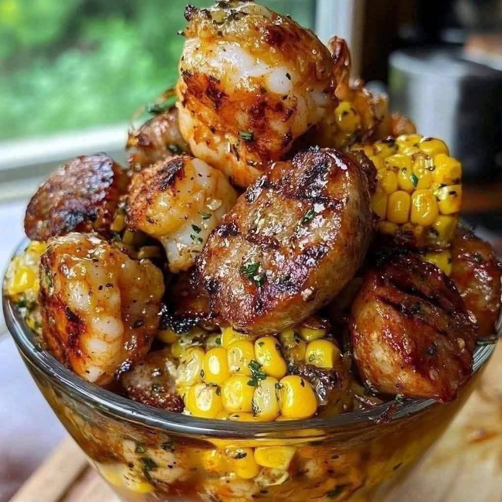 Southern-style shrimp boil with smoked sausage, sweet corn, and savory stuffing for a hearty seafood dinner.