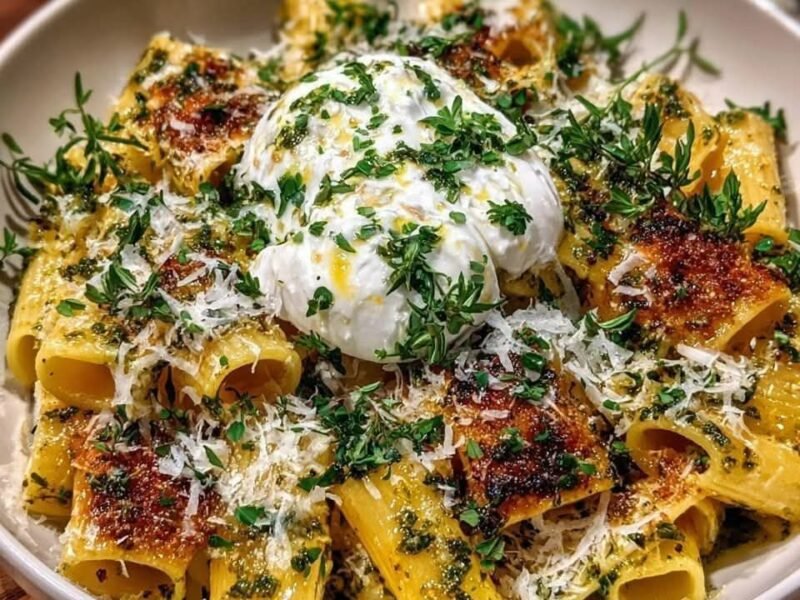 Baked Rigatoni with Burrata, Basil Pesto, and Lemon