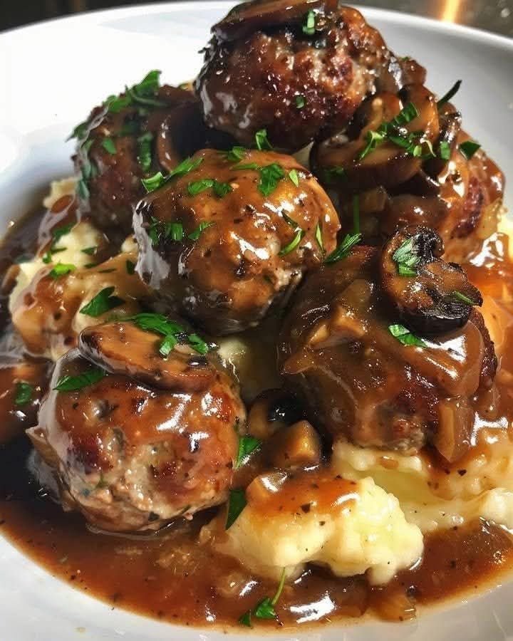 Tender beef meatballs simmered in a rich mushroom and onion gravy with Worcestershire and Dijon for deep flavor.